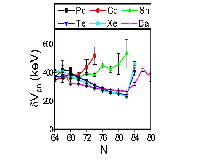 Measurements of p-n Interaction Strengths d. Vpn Average p-n interaction between last protons and last neutrons Double Difference of Binding Energies Vpn (Z, N) = ¼ [ {B(Z, N) - B(Z, N-2)} - {B(Z-2, N) - B(Z-2, N-2)} ] Ref: J. -y. Zhang and J. D. Garrett