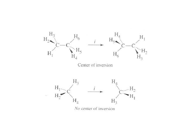 Operation 4: Inversion: i Center of inversion or center of symmetry (x, y, z) (-x, -y, -z) in = E (n is even) in = i (n is odd)