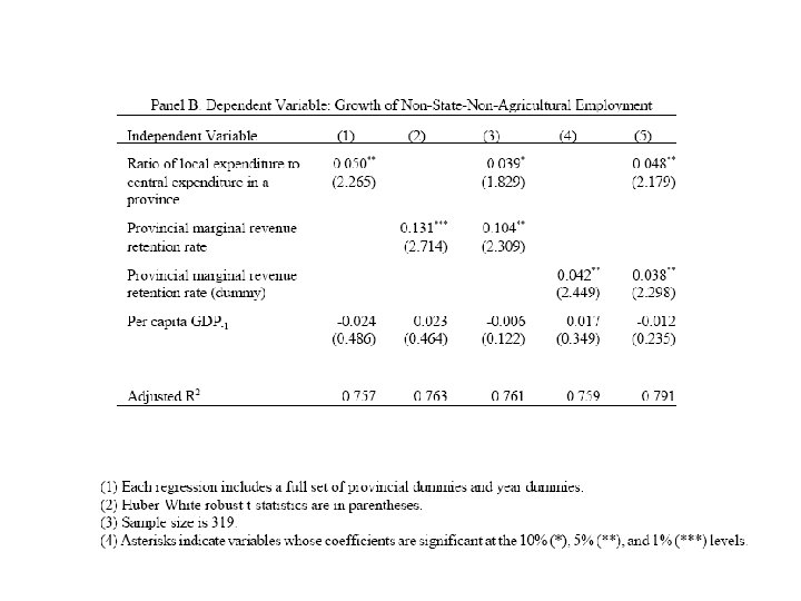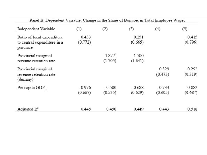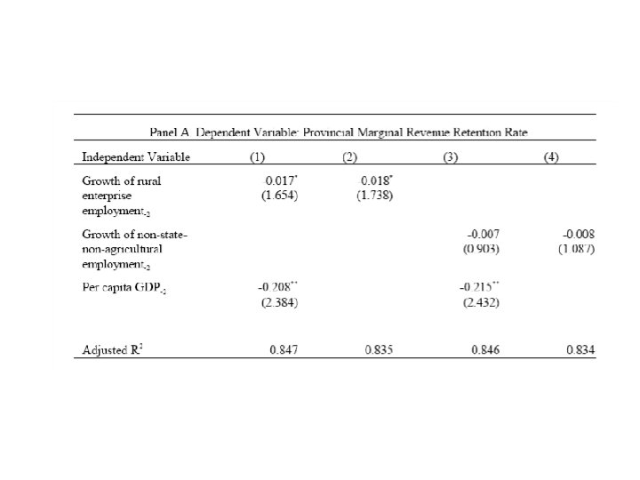A simple model (Jin et al. 2004) • Call Y(e) value created by local businesses and e the reform and pro-business policies and regulations pursued by local government, d. Y/de >0. There is however a cost associated to e, c(e) (convex) since status quo is not pro-business. • Call y(Y(e)) the tax revenue generated, dy/d. Y >0, y concave positive function of e. • Local government maximizes zvy(Y(e))-R- c(e) +T where v is local share of revenues, z is marginal retention rate of local revenues, R is lump sum remittances to central government and T is transfers received from central government.