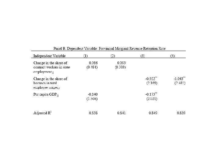 • Increasing correlation over time between budgetary expenditures and revenue. Suggests both that provinces were residual claimants over their revenue and that they were fiscally responsible. • Strong contrast with findings of Zhuravskaya (2000) for Russia.