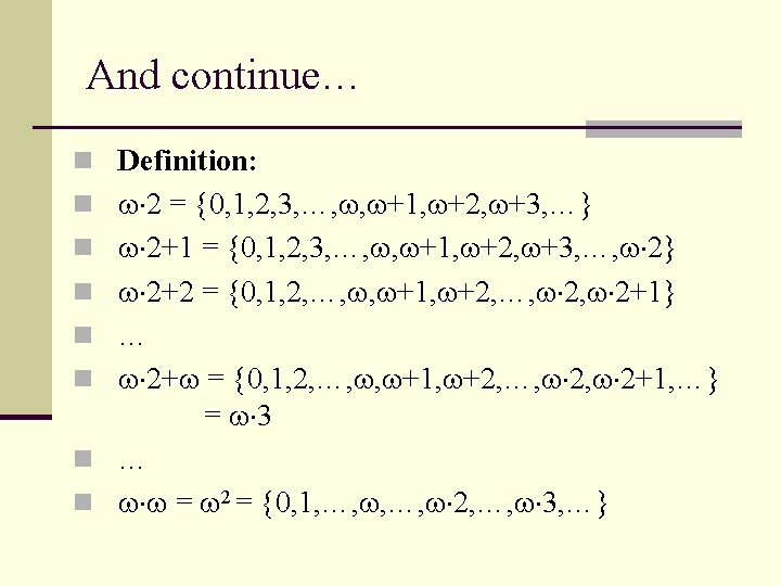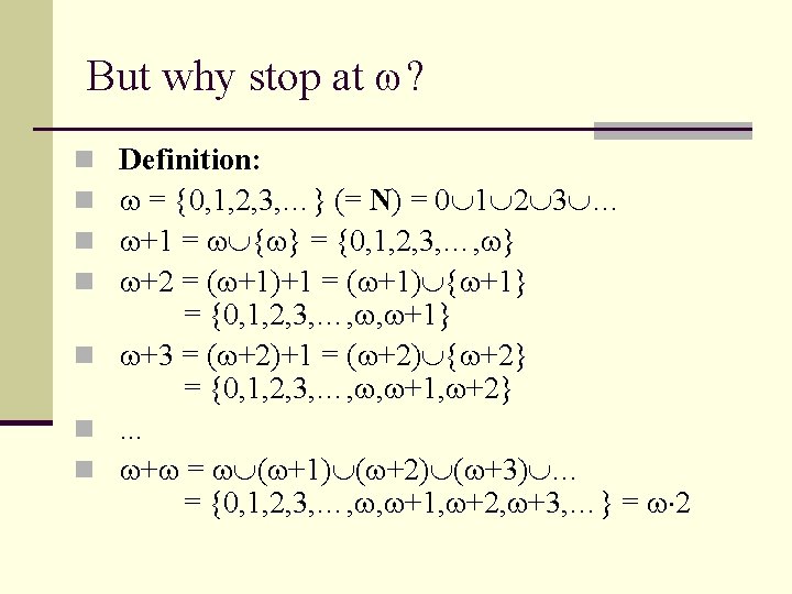 Ordinal Arithmetic: Addition n Definition: We define the sum of two ordinals + by recursion on : n Base ( = 0): +0= n Successor ( = + 1): + ( + 1) = ( + ) + 1 = ( + ) {( + )} n Limit ( = sup{ : < }): + = sup{ + : < } n Note: . The definition generalizes the addition of natural numbers. n Example: 1+ = < +1, so ordinal addition is not commutative, i. e. + + , in general.