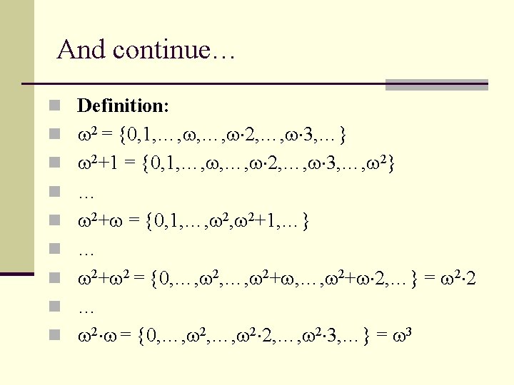 The Infinite Ordinal n For n, m N, (n m n < m) n Thus, we actually defined the order structures: n n n (n, <) = (n, ) On each n, is a transitive relation, i. e. ( i, j, k N)(i j k i k) Also, 0 1 2 3 … N Definition: = {0, 1, 2, 3, …} = N