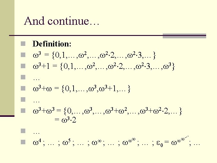Ordinals versus Cardinals n Notes: n Cardinals measure sizes of sets n Ordinals measure lengths of well ordered sets n All ordinals mentioned so far, e. g. . and 0 = are actually countable sets. n There are however uncountable ordinals, 1 is the least uncountable ordinal. n In fact, 1 = the set of all countable ordinals. n Need to define what ordinals really are.