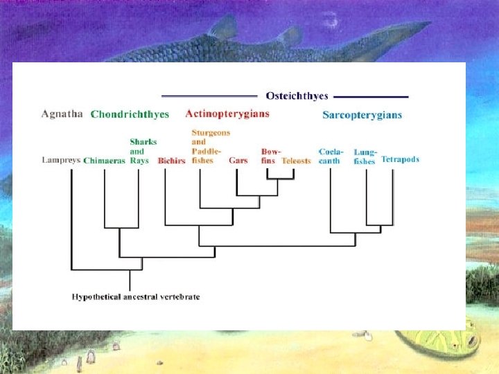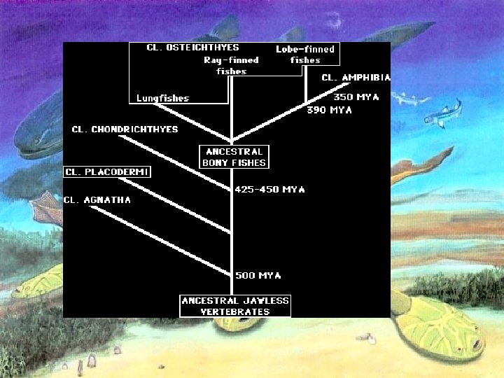 FISH GROUP KEY FEATURE Jawless Fish (agnathas) 500 mya - no jaws - no paired fins - gave rise to placoderms, cartilaginous and bony fish Placoderms – First Jawed Fish (Gnathostome) 439 mya -Jaws without teeth - Armored fish -Paired fins Cartilaginous (Chondrichthyes) 395 mya - cartilage skeletons - no swim bladder - no lungs - internal fertilization Bony (Osteichthyes) Actinopterygians (ray-finned) Sarcopterygians (lobe-finned) - gills - lungs - swim bladder - some developed fleshy lobe fins (gave rise to amphibians)
