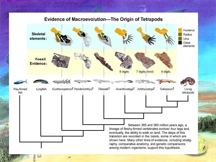 What is the Evidence for Tetrapod Evolution? • Homologous Structures – The front fins of certain sarcopterygian fishes and the front limbs of tetrapods share the same bones: humerus, ulna, and radius. – The hind fins of certain sarcopterygian fishes and the hind limbs of tetrapods share the same bones: femur, tibia, and fibula. • Sarcopterygian fins are paddle-like, while tetrapod limbs have digits (fingers and toes) that grip the ground