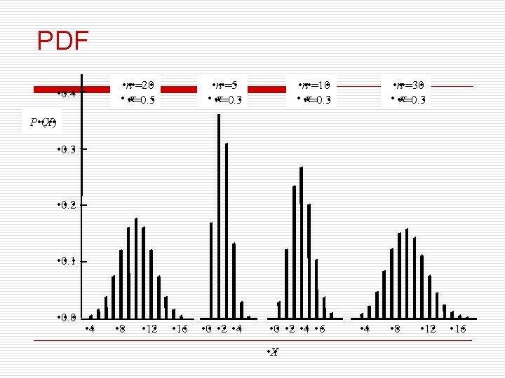 probability density function(PDF) o The model is concerned with the total number of successes in n trials as a o random variable, denoted by X. Its probability density function is given by nthe number of combinations of x objects selected from a set of n 60