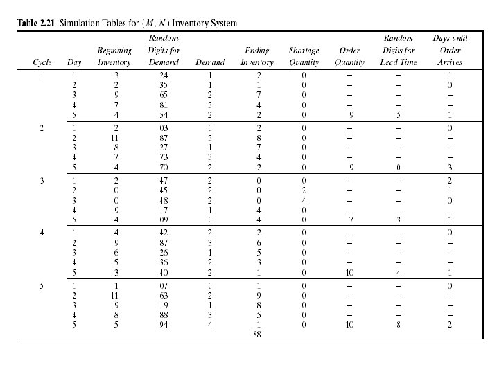 Simulation of Inventory Systems (8) Example 2. 4 (Cont. ) n n For purposes of this example, only five cycles will be shown. The random-digit assignments for daily demand lead time are shown in the rightmost columns of Tables 2. 19 and 2. 20.