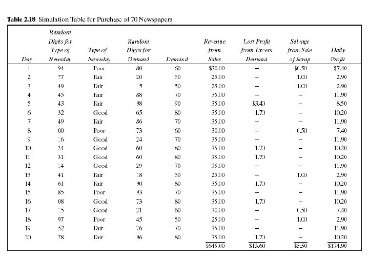 Simulation of Inventory Systems (6) Example 2. 3 (Cont. ) n n The simulation table for the decision to purchase 70 newspapers is shown in Table 2. 18. The profit for the first day is determined as follows: Profit = $30. 00 - $23. 10 - 0 + $. 50 = $7. 40 w On day 1 the demand is for 60 newspapers. The revenue from the sale of 60 newspapers is $30. 00. w Ten newspapers are left over at the end of the day. w The salvage value at 5 cents each is 50 cents. n n n The profit for the 20 -day period is the sum of the daily profits, $174. 90. It can also be computed from the totals for the 20 days of the simulation as follows: Total profit = $645. 00 - $462. 00 - $13. 60 + $5. 50 = $174. 90 The policy (number of newspapers purchased) is changed to other values and the simulation repeated until the best value is found.