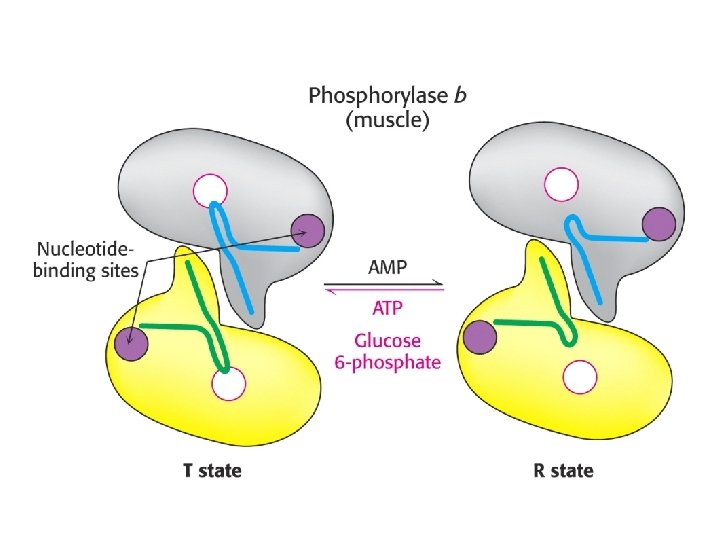 In Muscle • High [AMP] shifts the equilibrium to the active R state. – The muscle cell has a low energy charge. • High [ATP] and [glucose 6 -phosphate] shifts the equilibrium to the less active T state. • So the energy charge in muscle cells regulates the transition between T and R states for phosphorylase b.