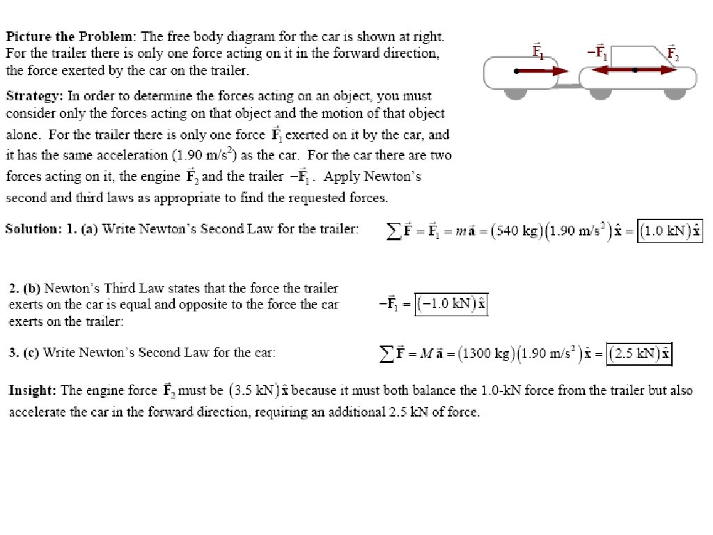 On vacation, your 1300 -kg car pulls a 540 -kg trailer away from a stoplight with an acceleration of 1. 9 m/s 2 (a) What is the net force exerted by the car on the trailer? (b) What force does the trailer exert on the car? (c) What is the net force acting on the car?