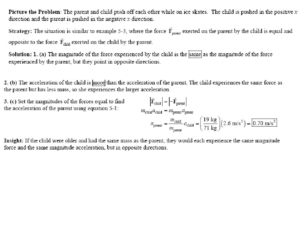 A 71 -kg parent and a 19 -kg child meet at the center of an ice rink. They place their hands together and push. (a) Is the force experienced by the child more than, less than, or the same as the force experienced by the parent? (b) Is the acceleration of the child more than, less than, or the same as the acceleration of the parent? Explain. (c) If the acceleration of the child is 2. 6 m/s 2 in magnitude, what is the magnitude of the parent’s acceleration?