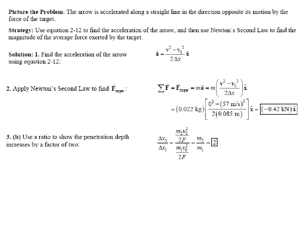 An archer shoots a 0. 022 -kg arrow at a target with a speed of 57 m/s. When it hits the target, it penetrates to a depth of 0. 085 m. (a) What was the average force exerted by the target on the arrow? (b) If the mass of the arrow is doubled, and the force exerted by the target on the arrow remains the same, by what multiplicative factor does the penetration depth change? Explain.