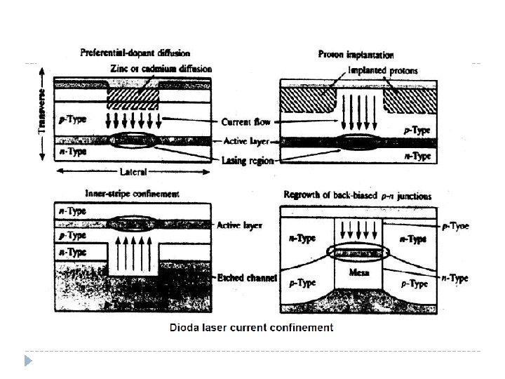 � 4 basic methods of current-confinement, each method holds the current on both sides of the lasing area, by means of the highresistivity area or the reverse voltage of the PN junction: - Preferential-dopant diffusion : - Proton implantation - Inner-stripe confinement - Regrowth of back-biased pn junction