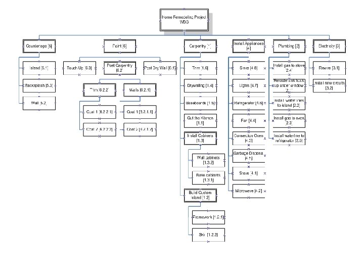 Work Breakdown Structure (WBS) • Illustrates project scope • Describes project subcomponents as: – Activities (verbs) – “install new plumbing” or – Deliverables (noun) – “new plumbing”