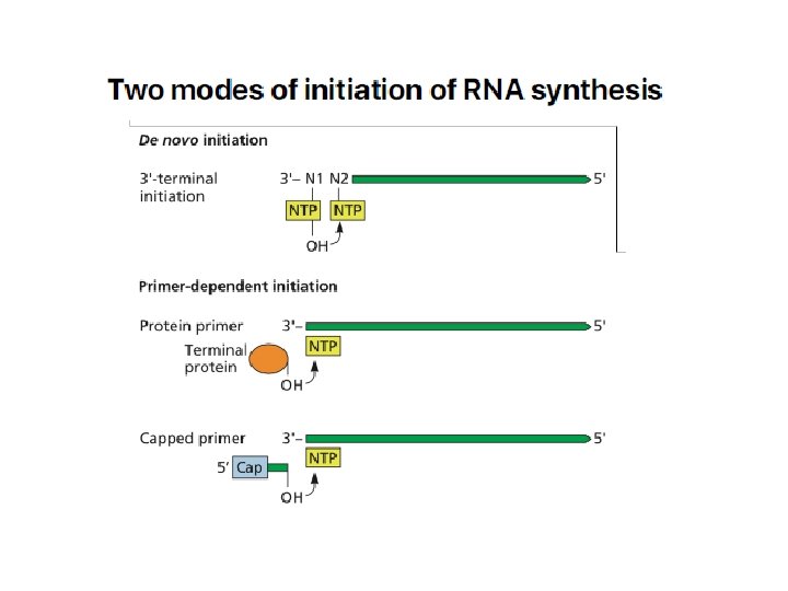 Universal rules for RNA-directed RNA synthesis • RNA synthesis initiates and terminates at specific sites on the template • Rd. Rp may initiate synthesis de novo (like cellular Dd. Rp) or require a primer • Other viral and cell proteins may be required • RNA is synthesized by template-directed stepwise incorporation of NTPs, elongated in 5’-3’ direction • Some non-templated synthesis