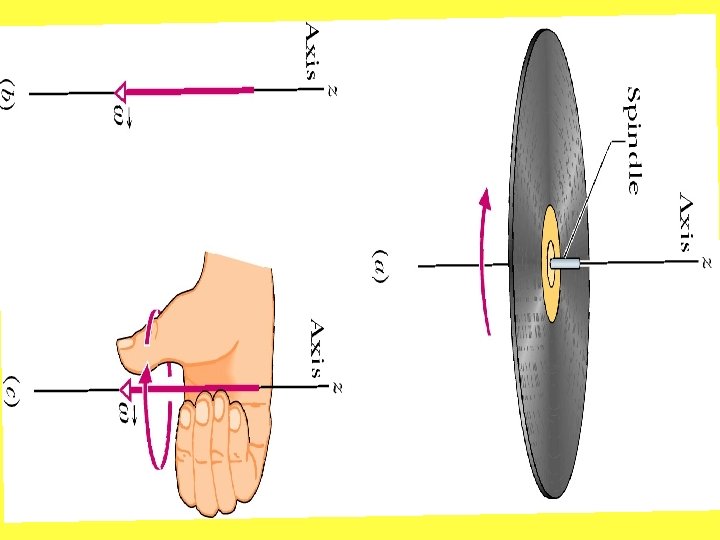 ROTATION ABOUT A FIXED AXIS • Spin an rigid object and define rotation axis. • Define angular displacement, angular velocity and angular acceleration. • Show angle is measured positive (counterclockwise). • Interpret signs of angular velocity and acceleration. • Point out analogy to 1 D motion for the variables. • Point out that omega and alpha are vectors that lie along the axis of rotation for a fixed axis of rotation Angular displacements are not vectors. Show the figure with two angular displacements of a book.