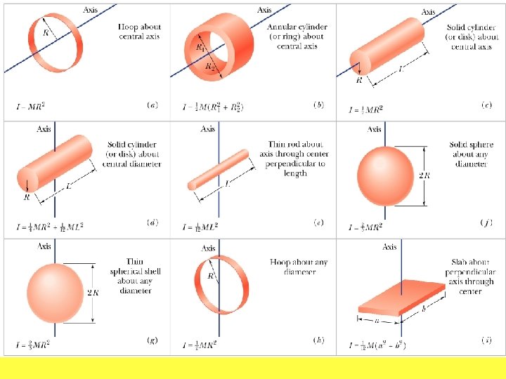 Summary of Concepts to Cover from chapter 10 Rotation • Rotating cylinder with string wrapped around it: example • Kinematic variables analogous to linear motion for constant acceleration • Kinetic energy of rotation • Rotational inertia • Moment of Inertia • Parallel axis theorem