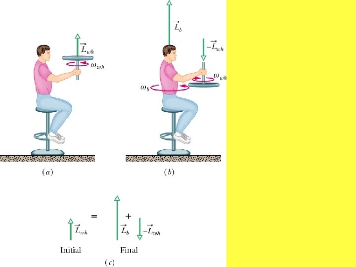 Conservation of angular momentum and it’s vector nature Sit on stool with dumbells held straight out 180 degrees apart. Slowly rotate the stool then bringarms in towards body. Angular velocity will increase drastically. Spin up bicycle wheel on buffer and hold its axis vertical while sitting on the stool. Slowly rotate the wheel axis 180 degrees and the stool will rotate in accordance with the law of conservation of angular momentum.