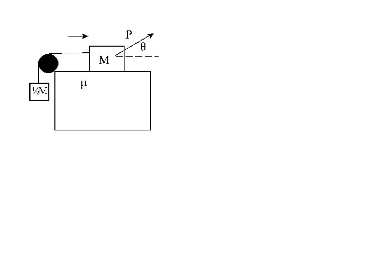Example with friction and two objects A block of mass M is moving to the right on a rough horizontal surface because a pulling force of magnitude P is applied to the block at an angle of θ with respect to the horizontal. The block remains in contact with the surface at all times, and the coefficient of kinetic friction between block and surface is μ. The block is connected to the end of a massless string that runs over a massless frictionless pulley. A block of mass ½M is suspended from the other end of the string. Derive an expression for the tension in the string. If we don’t have enough time in lecture to finish working through the problem, please see video on the course website.