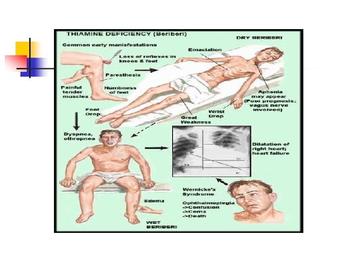 Deficiency of Thiamin n n Occurs where rice is the only staple Dry beri n n Weakness, nerve degeneration, irritability, poor arm/leg coordination, loss of nerve transmission Wet beri n Edema, enlarge heart, heart failure