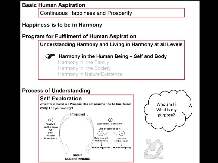 Self Consciousness Body INFORMATION Instruction Sensation Material I am My body is I want to live My body is used as an instrument I want to live with continuous happiness Physical facility is required for nurturing, protection and right utilization of the body To understand to live in harmony at all levels of being (from self to entire existence) is my program of action for continuous happiness Production, protection and right utilization of physical facility is a part of my program (<1/4 th) I am the: Seer, Doer, Enjoyer (Experiencer) I use the body as an instrument for fulfillment my program nz’Vk] drk. Z] Hkks. Drk 7