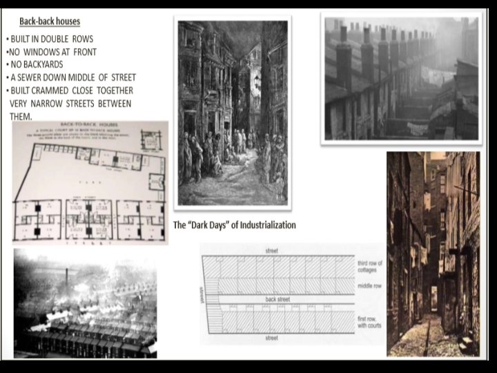 Architectural Character of the cities • Cities developed around factories. • Houses built in courts with principle that 3 walls are shared with other houses reducing the amount of material used. • It was very compact and streets are very narrow and would not allow for light or sufficient air to enter the house.