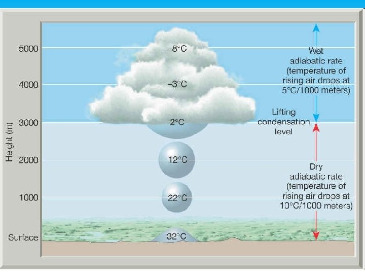 • The change in temperature due to a change in altitude of a condensing parcel • Abbreviated WALR = ~0. 6°C/100 m WALR = ~6°C/1000 m WALR = ~3. 3°F/1000 ft CANNOT apply to descending air masses COOLS • • • 18. 5°C 19. 0°C 18. 5°C 19. 5°C 20°C 21. 5°C WARMS at the DALR Wet Adiabatic Lapse Rate (WALR)