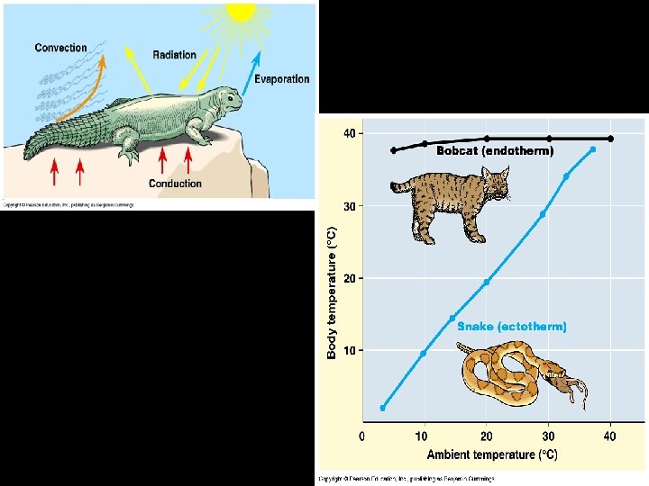 Regulation of body temperature • Thermoregulation • 4 physical processes: – Conduction ~ transfer of heat between molecules of body and environment – Convection ~ transfer of heat as water/air move across body surface – Radiation ~ transfer of heat produced by organisms – Evaporation ~loss of heat from liquid to gas • Sources of body heat: – Ectothermic: determined by environment – Endothermic: high metabolic rate generates high body heat