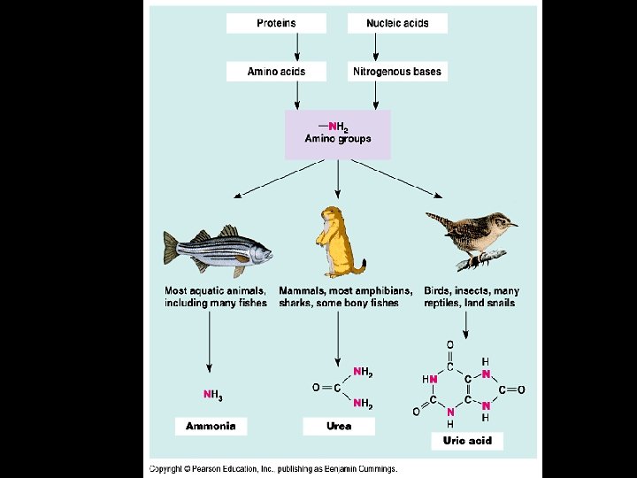Water balance and waste disposal • Osmoregulation: – management of the body’s water content and solute composition • Nitrogenous wastes: – breakdown products of proteins and nucleic acids; ammonia-very toxic • Deamination – Ammonia: most aquatic animals, many fish – Urea: mammals, most amphibians, sharks, bony fish (in liver; combo of NH 3 and CO 2) – Uric acid: birds, insects, many reptiles, land snails