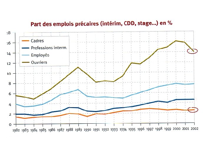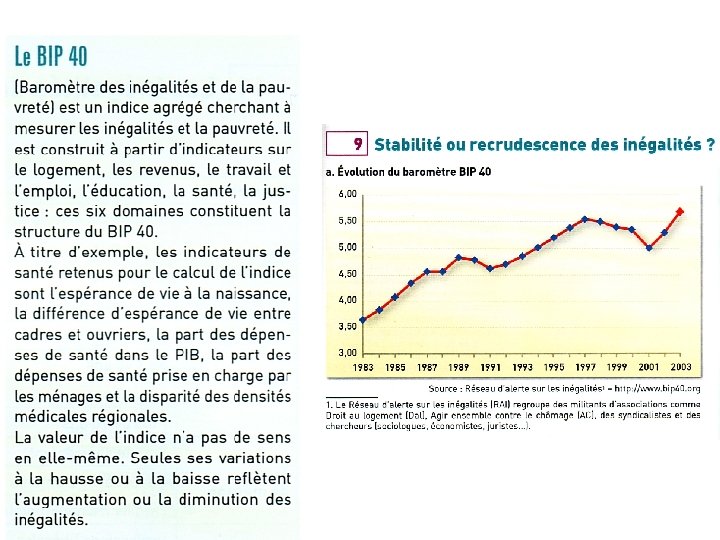 Evolution des inégalités dynamiques Rapport du salaire cadres/ouvriers 1955 1960 1965 1970 1975 1980 1985 1990 1995 1998 2000 2005 2007 3, 9 4, 0 3, 8 3, 4 2, 9 2, 7 2, 8 2, 6 2, 5 2, 6 2, 7 Croissance annuelle depuis 5 ans du pouvoir d’achat du salaire ouvrier (%) 4, 8 2, 8 3, 5 3, 7 3, 5 1, 6 0, 3 0, 6 0, 4 0, 5 0, 6 Temps de rattrapage en années 29, 1 49, 7 40, 0 36, 8 35, 7 65, 1 371, 9 353, 0 316, 2 150, 2 270 180 166 Source : Louis Chauvel, insee.
