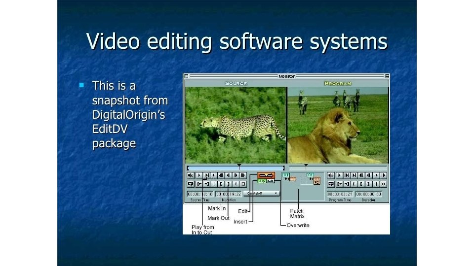Editing Digital Video • Clip Logging • Assembling • Transitions • dissolves • wipes, etc. • Rotoscoping • Frame Editing (Digital Effects) • Compositing • keying • titling