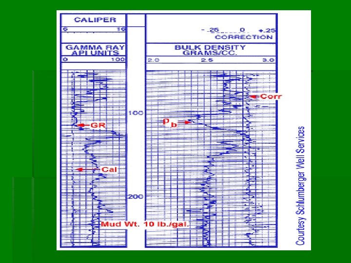 Density Log The formation density log is a porosity log that measures electron density of a formation. The density logging device is a contact tool which consists of a medium-energy gamma ray source that emits gamma rays into a formation. The gamma ray source is either Cobalt-60 or Cesium 137. A density derived porosity curve is sometimes presented in tracks #2 and #3 along with the bulk density and correction curve . The most frequently used scales are a range of 2. 0 to 3. 0 gm/cc or 1. 95 to 2. 95 gm/cc across two tracks. Track #1 contains a gamma ray log and caliper Formulation bulk density is a function of matrix density, porosity, and density of the fluid in the pores (salt, mud, fresh mud, or hydrocarbons). Density is one of the most important pieces of data in formation evaluation. In the majority of the wells drilled, density is the primary indicator of porosity. In combination with other measurements, it may also be used to indicate lithology and formation fluid type.