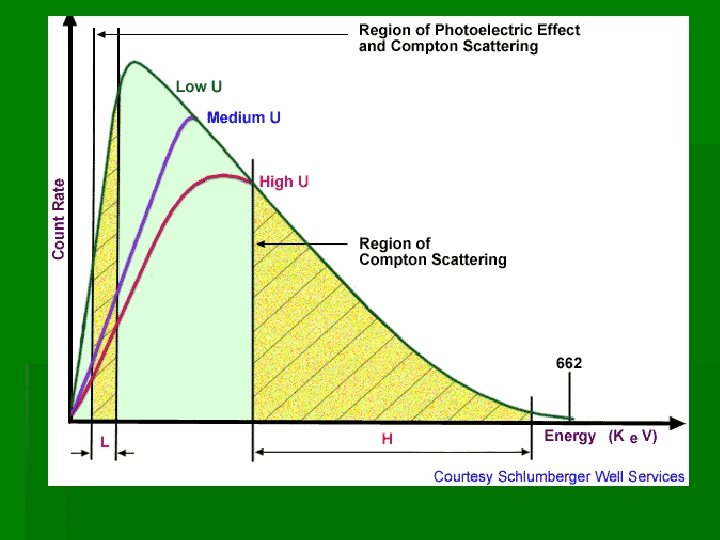 LITHOLOGIC DENSITY TOOL The Pe, or lithodensity log, run with the lithodensity tool (LDT), is another version of the standard formation density log. In addition to the bulk density (rb), the tool also measures the photoelectric absorption index (Pe) of the formation. This new parameter enables a lithological interpretation to be made without prior knowledge of porosity. The photoelectric effect occurs when a gamma ray collides with an electron and is absorbed in the process, so that all of its energy is transferred to the electron. The probability of this reaction taking place depends upon the energy of the incident gamma rays and the type of atom. The photoelectric absorption index of an atom increases as its atomic number, Z, increases. Pe = (0. 1. Zeff) 3. 6