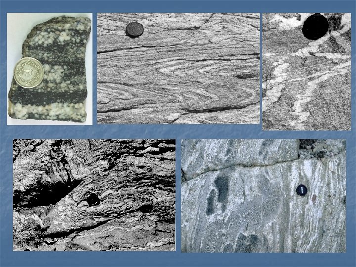 4 - High temperature metapelites ØAt high-temperatures, above or coeval to sillimanite zone, metapelites undergo partial melting, and the yielded rock is known as Migmatites. ØThe Migmatites are mixed rocks predominantly schists but with pads, veins or layers of leucocratic material of granitic composition. The leucocratic (granitic) materials are well known as leucosomes, while the metamorphic parts are known as mesosome (resistite) and melansomes. Agmatitic Vein-type Nebulitic Philibitic Stromatic