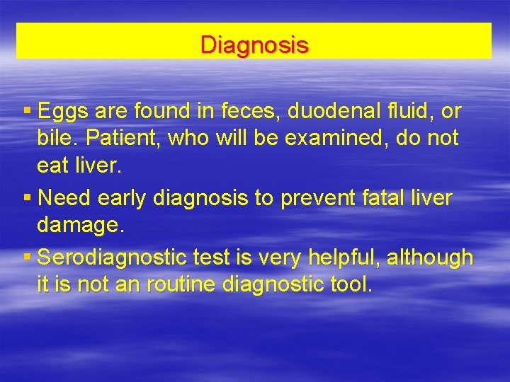 Diagnosis § Eggs are found in feces, duodenal fluid, or bile. Patient, who will be examined, do not eat liver. § Need early diagnosis to prevent fatal liver damage. § Serodiagnostic test is very helpful, although it is not an routine diagnostic tool.