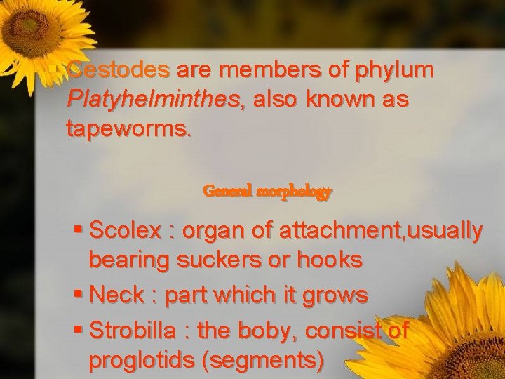 § Cestodes are members of phylum Platyhelminthes, also known as tapeworms. General morphology § Scolex : organ of attachment, usually bearing suckers or hooks § Neck : part which it grows § Strobilla : the boby, consist of proglotids (segments)