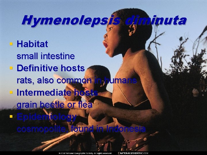 Hymenolepsis diminuta § Habitat small intestine § Definitive hosts rats, also common in humans § Intermediate hosts grain beetle or flea § Epidemiology cosmopolite, found in Indonesia