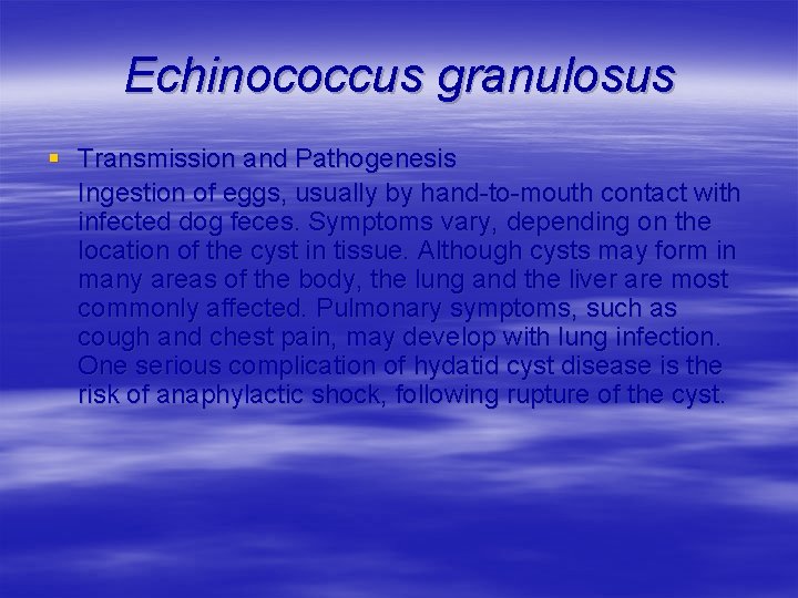 Echinococcus granulosus § Transmission and Pathogenesis Ingestion of eggs, usually by hand-to-mouth contact with infected dog feces. Symptoms vary, depending on the location of the cyst in tissue. Although cysts may form in many areas of the body, the lung and the liver are most commonly affected. Pulmonary symptoms, such as cough and chest pain, may develop with lung infection. One serious complication of hydatid cyst disease is the risk of anaphylactic shock, following rupture of the cyst.