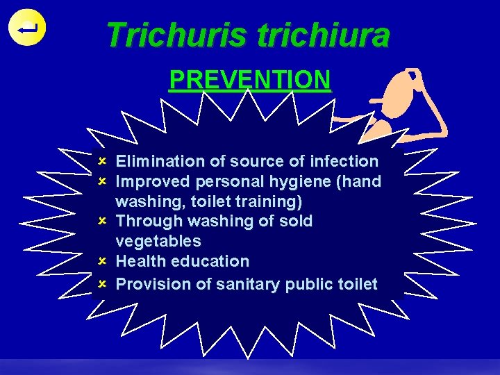 PREVENTION r Similar to the prevention of hookworm r Autoinfection is prevented by means of : – Avoid constipation – Anal hygiene