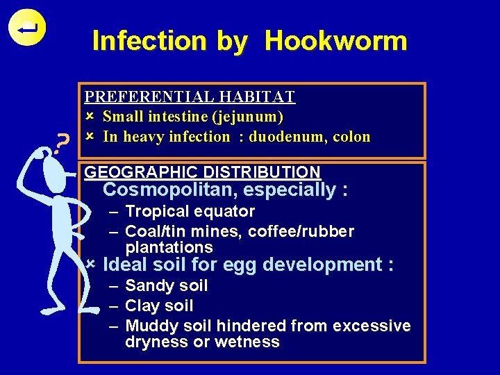 Infection by Hookworm PREFERENTIAL HABITAT û Small intestine (jejunum) û In heavy infection : duodenum, colon GEOGRAPHIC DISTRIBUTION Cosmopolitan, especially : – Tropical equator – Coal/tin mines, coffee/rubber plantations û Ideal soil for egg development : – – – Sandy soil Clay soil Muddy soil hindered from excessive dryness or wetness