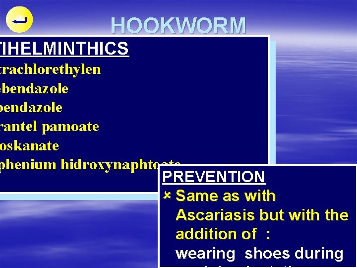 HOOKWORM TIHELMINTHICS trachlorethylen ebendazole rantel pamoate oskanate phenium hidroxynaphtoate PREVENTION û Same as with Ascariasis but with the addition of : wearing shoes during