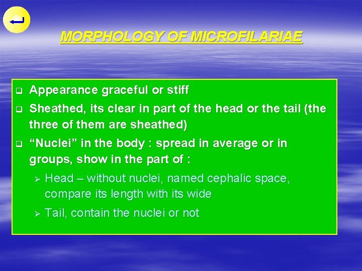 MORPHOLOGY OF MICROFILARIAE q Appearance graceful or stiff q Sheathed, its clear in part of the head or the tail (the three of them are sheathed) q “Nuclei” in the body : spread in average or in groups, show in the part of : Ø Head – without nuclei, named cephalic space, compare its length with its wide Ø Tail, contain the nuclei or not