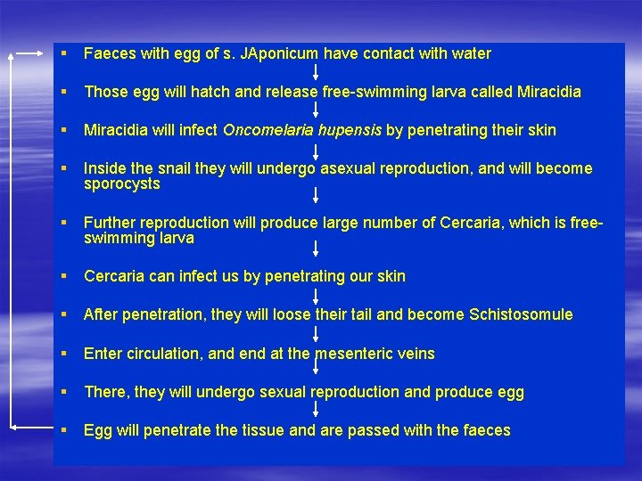 § Faeces with egg of s. JAponicum have contact with water § Those egg will hatch and release free-swimming larva called Miracidia § Miracidia will infect Oncomelaria hupensis by penetrating their skin § Inside the snail they will undergo asexual reproduction, and will become sporocysts § Further reproduction will produce large number of Cercaria, which is freeswimming larva § Cercaria can infect us by penetrating our skin § After penetration, they will loose their tail and become Schistosomule § Enter circulation, and end at the mesenteric veins § There, they will undergo sexual reproduction and produce egg § Egg will penetrate the tissue and are passed with the faeces
