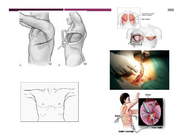 APPROACHES FOR PULMONARY RESECTION Thoracotomy: postero-lateral thoracotomy in lateral decubitus position, anterior thoracotomy in supine position, posterior peri-scapular thoracotomy in prone position, bilateral anterior thoracotomy with or without transverse sternotomy in bilateral lung transplantation. Video-assisted thoracic surgery (VATS) (thoracoscopy): Median sternotomy and parasternal approaches: very rare.