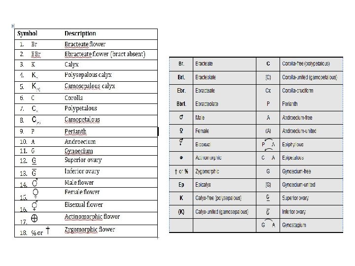 • Bracts and Epicalyx; Br……… Bracteate Ebr……. . . Ebracteate Brl………Bracteolate E………. . . Epicalyx • Symetry …. Actinomorphic or . Zygomorphic • Sex; …. . Staminate flower …. . Pistillate flower …. Hermaphrodite • Calyx; K…. Calyx K 4……Four free sepals K(4) …. Four fused sepals • Corolla; C……Corolla C 4…. . Four free petals C(4)…. Four fused petals • Perianth; P……. . Perianth P 5……. Five free tepals P(5)……Five fused tepals P 3+3…. . Six tepals in two whorls