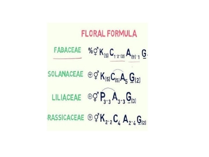 • Androecium; A………Androecium A 5……. . Five free stamens A(5)……Five fused stamen. A 5+5…. . Ten stamen in two whorl of five each A 0…………Stamens absent. A ……………. Stamen indefinite in number. C A… . . Stamens epipetalous P A…… Staens epiphyllous • Gynoecium; G………. . Gynoecium G 3………. three free carpels G(3)………three fused carpels. G 0………. . Carpels absent G_(2)……. . two fused carpel, overy superior G(3) ………Three fused carpel, semi inferior overy. G (2)………. Two fused carpel, inferior overy.