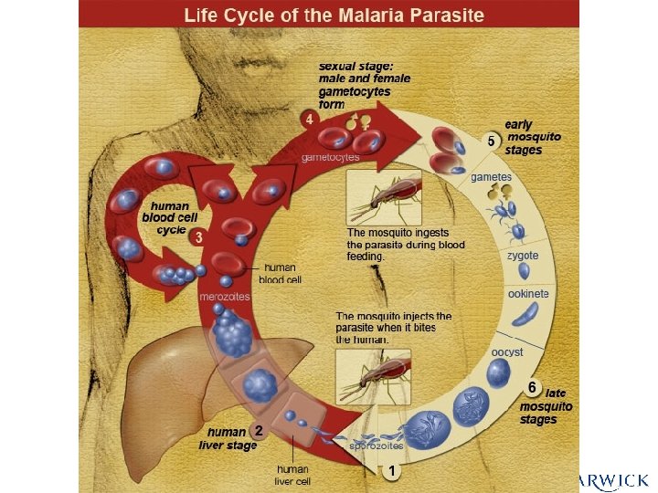 Malaria – Symptoms & Signs Benign + Falciparum Malaria : hot + cold sweats arthralgia + myalgia hepatosplenomegaly headache diarrhoea + vomiting anaemia Falciparum Malaria only : hypoglycaemia haemorrhage renal failure coagulopathy septic + hypovolaemic shock respiratory failure cerebral malaria = various CNS features that lead on to consciousness / fits / coma / death