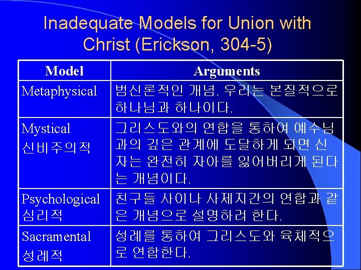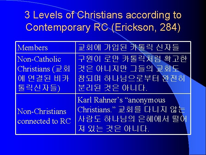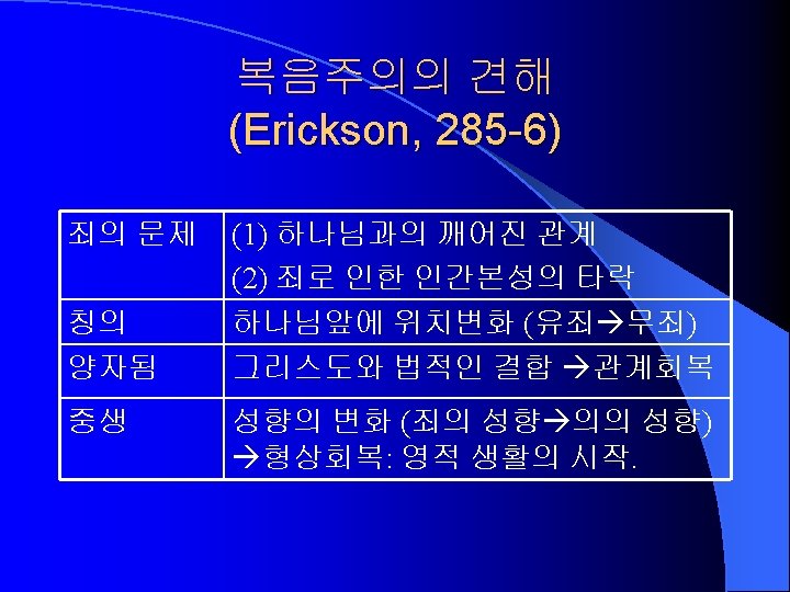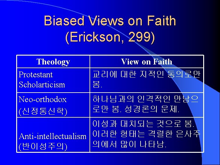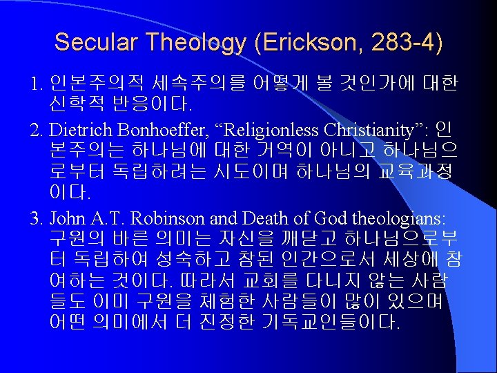 Liberation Theology (Erickson, 281 -2) Present Phenomena Problem of Society Scriptural View Kingdom Black, Feminist, Third world theologies (cf. 민중신학) Oppression and exploitation of the powerless classes by the powerful. Capitalism and bad political system. The Bible identifies with the oppressed. The redemptive history is the history of the oppressed people. In this present age