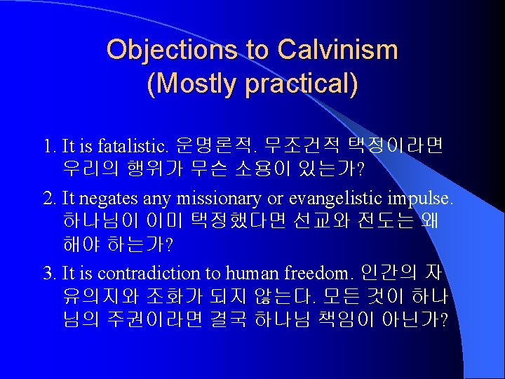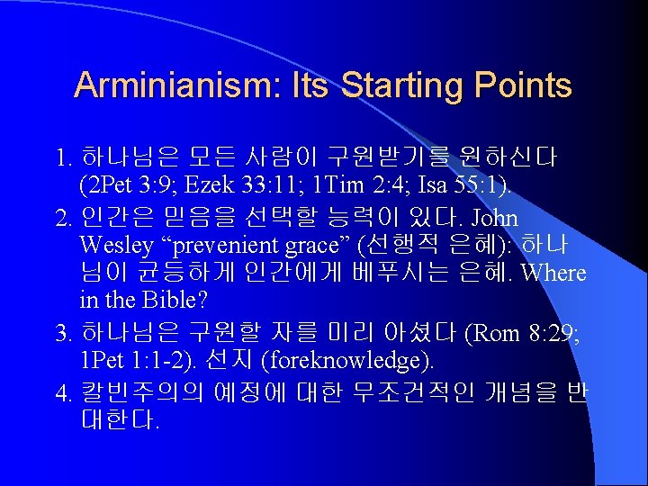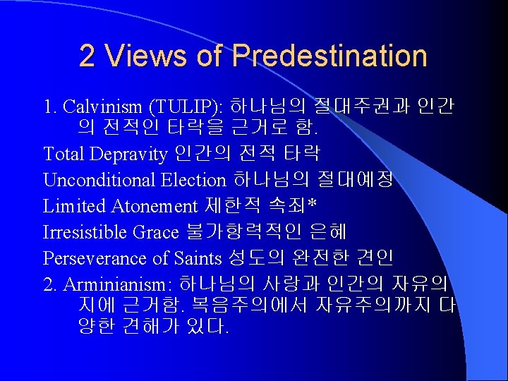 Historical Development of Predestination 1. Debate: Augustine vs. Pelagius 2. Semi-Pelagianism: AD 431 Ephesus. 3. Anselm & Aquinas: Augustinian. 11’th – 13’th c. 4. Duns Scotus – 14’th c. Predestination by “foreknowledge” (예지예정) – Pelagian. 5. Debate: Luther (Augustinian) vs. Erasmus (Free will). John Calvin. 6. J. Arminius: 16’th-17’th c. Semi-Pelagianism. 예 지예정. 7. John Wesley: 18’th c. “Prevenient grace” 선행적 은총. 알미니안 주의를 일반화시킴.