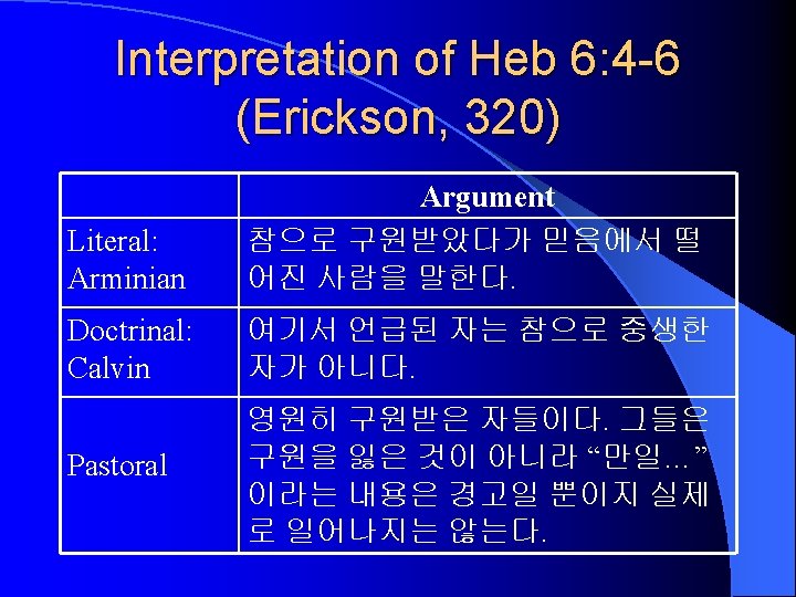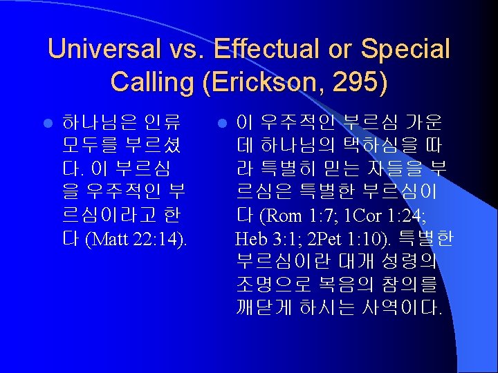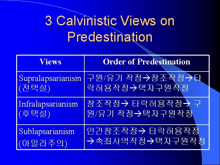 Antecedents to Salvation: 4 Terms Foreordination (선작정) Predestination (예정) Election (택정) Reprobation (유기) Definition 모든 일에 대하여 미리 세워진 하 나님의 뜻 인간의 구원과 멸망에 대하여 세 우신 하나님의 뜻 영생을 받는 구원받을 자의 택정 (Positive side of Predestination) 구원받지 못할 자의 택정 (Negative side of Predestination)
